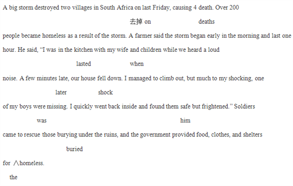 A big storm destroyed two villages in South Africa on last Friday, causing 4 death. Over 200 people became homeless as a result of the storm. A farmer said the storm began early in the morning and last one hour. He said, “I was in the kitchen with my wife and children while we heard a loud noise. A few minutes late, our house fell down. I managed to climb out, but much to my shocking, one of my boys were missing. I quickly went back inside and found them safe but frightened.” Soldiers came to rescue those burying under the ruins, and the government provided food, clothes, and shelters for homeless.