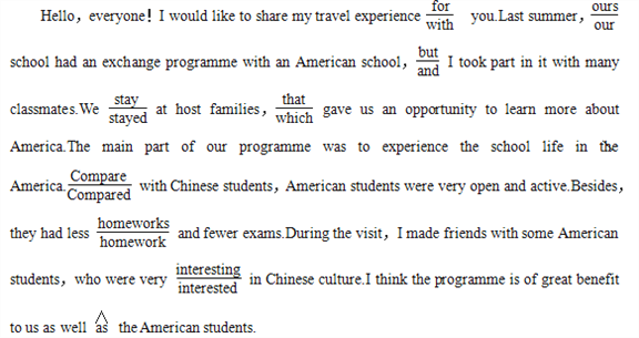 Hello,everyone!I would like to share my travel experience for you.Last summer,ours school had an exchange programme with an American school,but I took part in it with many classmates.We stay at host families,that gave us an opportunity to learn more about America.The main part of our programme was to experience the school life in the America.Compare with Chinese students,American students were very open and active.Besides,they had less homeworks and fewer exams.During the visit,I made friends with some American students,who were very interesting in Chinese culture.I think the programme is of great benefit to us as well the American students.