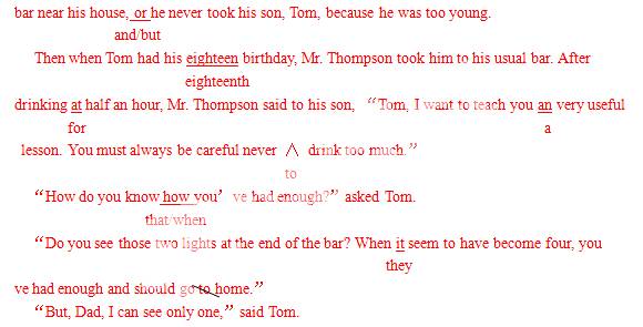 Then when Tom had his eighteen birthday, Mr. Thompson took him to his usual bar. After drinking at half an hour, Mr. Thompson said to his son, “Tom, I want to teach you an very useful lesson. You must always be careful never drink too much.”
