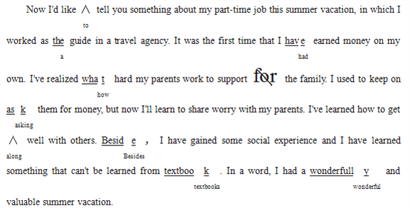 Now I'd like tell you something about my parttime job this summer vacation, in which I worked as the guide in a travel agency. It was the first time that I have earned money on my own. I've realized what hard my parents work to support for the family. I used to keep on ask them for money, but now I'll learn to share worry with my parents. I've learned how to get well with others. Beside, I have gained some social experience and I have learned something that can't be learned from textbook. In a word, I had a wonderfully and valuable summer vacation.