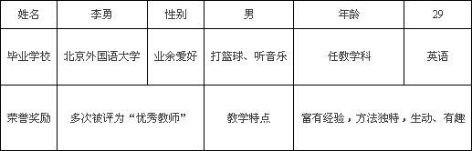 Li Yong, a 29¡ªyear-old teacher, teaches English in our school since he graduated from Beijing Foreign Studies University. He likes playing basketball and listening to music in his spare time. Though he is young, he is rich in teaching experience. What¡¯s more, he has a strange way to make his classes lively and interesting, which attracts the attention of all of us,