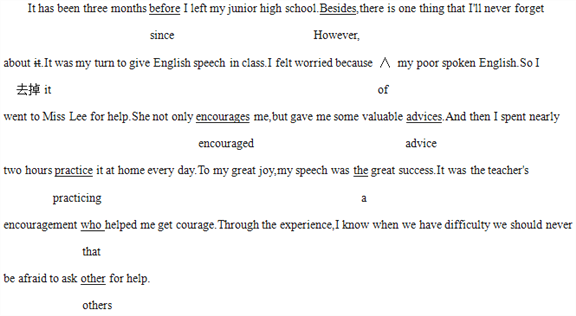 It has been three months before I left my junior high school.Besides,there is one thing that I'll never forget about it.It was my tum to give an English speech in class.I felt worried because my poor spoken English.So I went to Miss Lee far help.She not only encourages me,but gave me some valuable advices.And then I spent nearly two hours practice it at home every day.To my great joy,my speech was the great success.It was the teacher's encouragement who helped me get courage.Through the experience,I know when we have difficulty we should never be afraid to ask other for help.