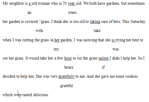 【题目】My neighbor is a old woman who is 70 year old. We both have gardens, but sometimes her garden is covered grass. I think she is too old to taking care of hers. This Saturday, when I was cutting the grass in her garden, I was noticing that she is trying her best to cut her grass. It would take her a few hour to cut the grass unless I didn’t help her. So I decided to help her. She was very gratefully to me. And she gave me some cookies which were tasted delicious.