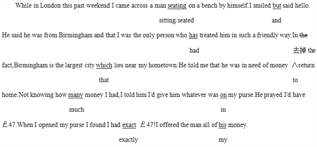 【解析】1.句意:我偶然遇见一个独自坐在长椅上的人,seat作动词时,表示“向……提供座位,使……就座”,所以要表达某人落座应使用被动语态:sb be seated; 如果一定要使用主动语态,可以用sit这个词,故把seating改为sitting或seated.