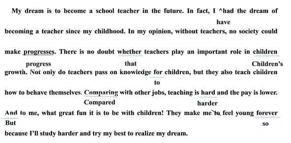 My dream is to become a school teacher in the future. In fact, I had the dream of becoming a teacher since my childhood. In my opinion, without teachers, no society could make progresses. There is no doubt whether teachers play an important role in children growth. Not only do teachers pass on knowledge for children, but they also teach children how to behave themselves. Comparing with other jobs, teaching is hard and the pay is lower. And to me, what great fun it is to be with children! They make me to feel young forever because I’ll study harder and try my best to realize my dream.