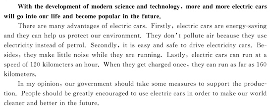 【亮点说明】People should be encouraged to use electric cars in order to make our world cleaner and better in thefuture.这里含有被动语态和非谓语结构。