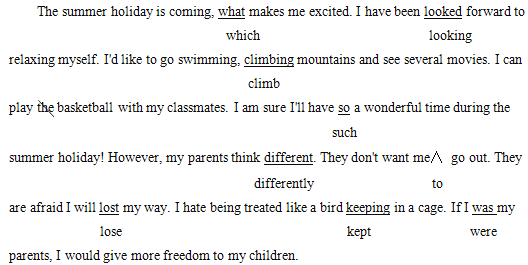 The summer holiday is coming, what makes me excited. I have been looked forward to relaxing myself. I'd like to go swimming, climbing mountains and see several movies. I can play the basketball with my classmates. I am sure I'll have so a wonderful time during the summer holiday! However, my parents think different. They don't want me go out. They are afraid I will lost my way. I hate being treated like a bird keeping in a cage. If I was my parents, I would give more freedom to my children.