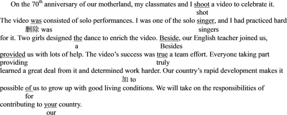 On the 70th anniversary of our motherland, my classmates and I shoot a video to celebrate it. The video was consisted of solo performances. I was one of the solo singer, and I had practiced hard for it. Two girls designed the dance to enrich the video. Beside, our English teacher joined us, provided us with lots of help. The video’s success was true a team effort. Everyone taking part learned a great deal from it and determined work harder. Our country’s rapid development makes it possible of us to grow up with good living conditions. We will take on the responsibilities of contributing to your country.