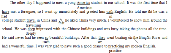 The other day I happened to meet a young America student in our school. It was the first time that I have met a foreigner, so I went up immediately and greeted him with English. He told me that he was a college student travel in China and he liked China very much. I volunteered to show him around the school. He was deep impressed with the Chinese buildings and was busy taking the photos all the time. He said never had he seen so beautiful buildings. After that, they went boating on the BingXi River and had a wonderful time. I was very glad to have such a good chance to practicing my spoken English.