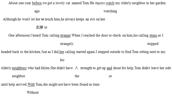 7. 句意:Tom挨着我年长已经摔倒的邻居坐着。根据第一段可知,邻居是一位,故把neighbors改为neighbor。
