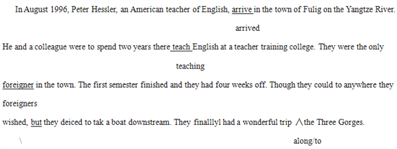 In August 1996, Peter Hessler, an American teacher of English, arrive in the town of Fulig on the Yangtze River. He and a colleague were to spend two years there teach English at a teacher training college. They were the only foreigner in the town. The first semester finished and they had four weeks off. Though they could to anywhere they wished, but they deiced to tak a boat downstream. They finalllyl had a wonderful trip the Three Gorges.