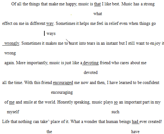 Of all the things that make me happy, music is that I like best. Music has a strong effect on me in different way. Sometimes it helps me feel in relief even when things go wrongly. Sometimes it makes me to burst into tears in an instant but I still want to enjoy it again. More importantly, music is just like a devoting friend who cares about me all the time. With this friend encouraged me now and then, I have learned to be confident of me and smile at the world. Honestly speaking, music plays so an important part in my life that nothing can take place of it. What a wonder that human begins had ever created!