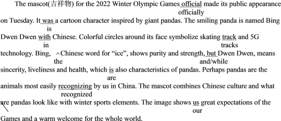 第六处:考查连词。句意:“冰”代表纯洁和力量,“Dwen Dwen”则代表真诚、活泼和健康,这也是熊猫的特点。Bing, Chinese word for “ice”, shows purity and strength和Dwen Dwen, means sincerity, liveliness and health两句话之间是并列关系,也可理解为对比关系。因此,应用连词and或while连接这两个句子。故将but改为and或while。