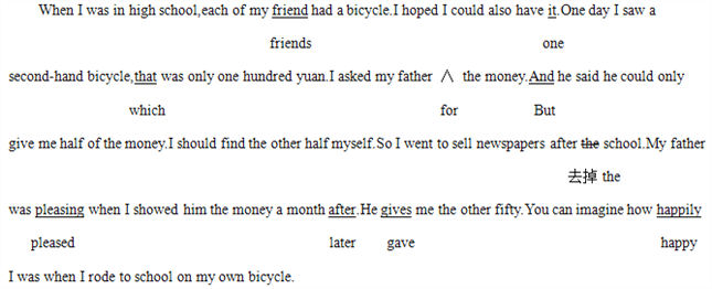 【解析】第一处:考查名词及固定搭配的应用。When I was in high school,each of my friend had a bicycle.句意:当我在高中时,我的每一个朋友都有自行车。each of+名词复数。故friend改为friends。