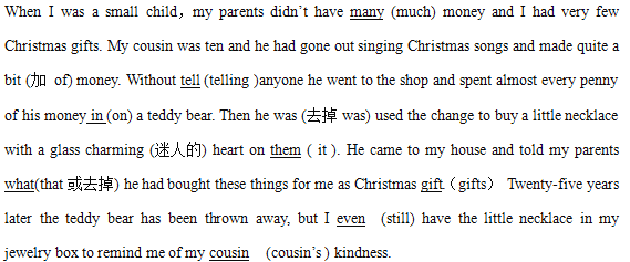 When I was a small child,my parents didn’t have many money and I had very few Christmas gifts. My cousin was ten and he had gone out singing Christmas songs and made quite a bit money. Without tell anyone he went to the shop and spent almost every penny of his money in a teddy bear. Then he was used the change to buy a little necklace with a glass charming (迷人的) heart on them. He came to my house and told my parents what he had bought these things for me as Christmas gift. Twenty-five years later the teddy bear has been thrown away, but I even have the little necklace in my jewelry box to remind me of my cousin kindness.