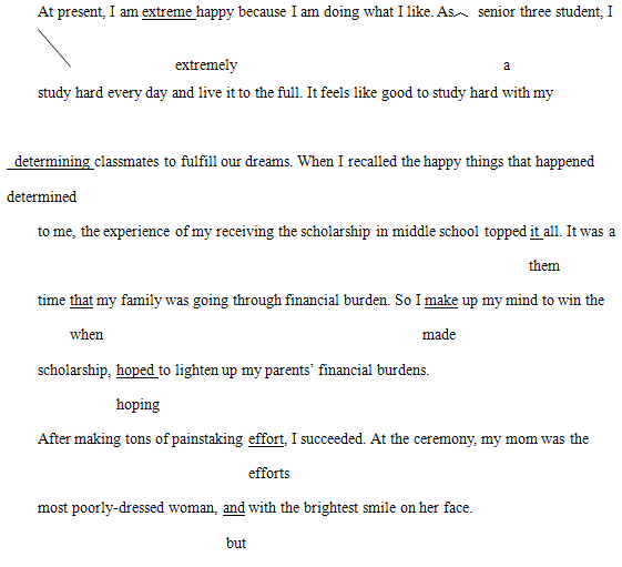 At present, I am extreme happy because I am doing what I like. As senior three student, I study hard every day and live it to the full. It feels like good to study hard with my determining classmates to fulfill our dreams. When I recalled the happy things that happened to me, the experience of my receiving the scholarship in middle school topped it all. It was a time that my family was going through financial difficulties. So I make up my mind to win the scholarship, hoped to lighten up my parents’ financial burdens. After making tons of painstaking effort, I succeeded. At the ceremony, my mom was the most poorly-dressed woman, and with the brightest smile on her face.