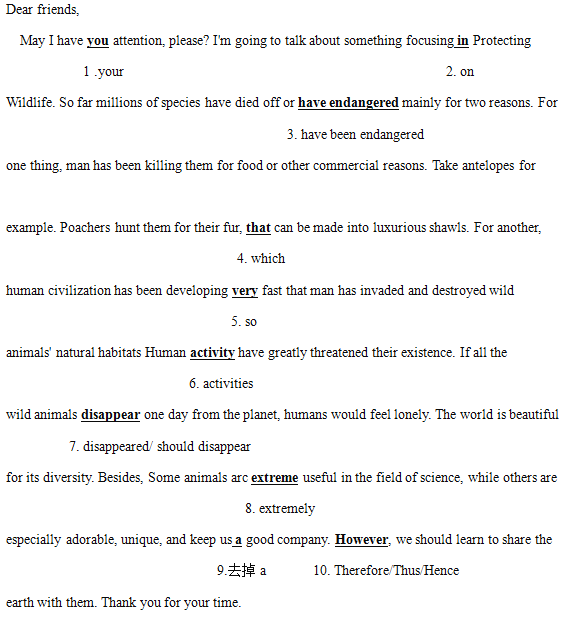 10. 考查连词。上文提到“动物是有用的、特别可爱的、独一无二的、陪伴我们的”,因此我们应该学会与他们共享地球,上下文是因果关系,不是转折关系。故However改为Therefore/Thus/Hence。