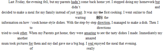 Last Friday, the evening fell, but my parents hadn’t come back home yet. I stopped doing my homework but decided to make a meal for my family instead of just wait. It was my the first cooking. I went online to find information on how cook home-style dishes. With the step-by-step direction, I managed to make a dish. Then I tried to cook other. When my Parents got home, they were amazing to see the tasty dishes I made. Immediately my mum took pictures for them and my dad gave me a big hug. I real enjoyed the meal that evening.