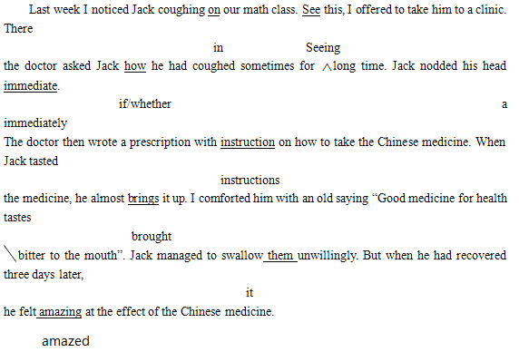 Last week I noticed Jack coughing on our math class. See this, I offered to take him to a clinic. There the doctor asked Jack how he had coughed sometimes for long time. Jack nodded his head immediate. The doctor then wrote a prescription with instruction on how to take the Chinese medicine. When Jack tasted the medicine, he almost brings it up. I comforted him with an old saying ¡°Good medicine for health tastes bitter to the mouth¡±. Jack managed to swallow them unwillingly. But when he had recovered three days later, he felt amazing at the effect of the Chinese medicine.