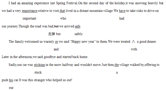 I had an amazing experience last Spring Festival.On the second day of the holiday,it was snowing heavily but we had a very importance relative to visit,that lived in a distant mountain village.We have to take risks to drive on our journey.Though the road was bad,but we arrived safe.