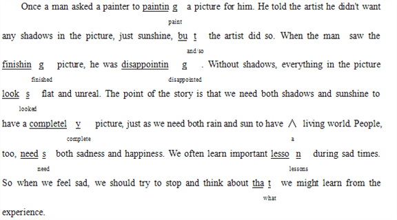 Once a man asked a painter to painting a picture for him. He told the artist he didn't want any shadows in the picture, just sunshine, but the artist did so. When the man saw the finishing picture, he was disappointing. Without shadows, everything in the picture looks flat and unreal. The point of the story is that we need both shadows and sunshine to have a completely picture, just as we need both rain and sun to have living world. People, too, needs both sadness and happiness. We often learn important lesson during sad times. So when we feel sad, we should try to stop and think about that we might learn from the experience.