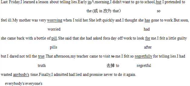 【题目】Last Friday,I learned a lesson about telling lies.Early in morning,I didn't want to go to school,but I pretended to feel ill.My mother was very worrying when I told her.She left quickly and.I thought she has gone to work.But soon, she came back with a bottle of pill.She said that she had asked fora day off work to look for me.I felt a little guilty but I dared not tell the true.That afternoon,my teacher came to visit to me.I felt so regretfully for telling lies.I had wasted anybody's time.Finally,I admitted had lied and promise never to do it again.