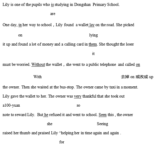Lily is one of the pupils who is studying in Dongshan Primary School. One day, in her way to school£¬Lily found a wallet lay on the road. She picked it up and found a lot of money and a calling card in them. She thought the loser must be worried. Without the wallet, she went to a public telephone and called on the owner. Then she waited at the bus-stop. The owner came by taxi in a moment. Lily gave the wallet to her. The owner was very thankful that she took out a 100-yuan note to reward Lily. But he refused it and went to school. Seen this, the owner raised her thumb and praised Lily helping her in time again and again.