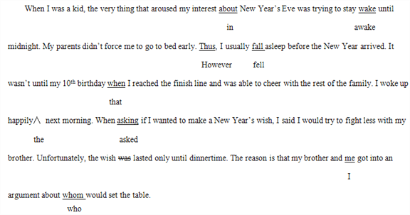 When I was a kid, the very thing that aroused my interest about New Year¡¯s Eve was trying to stay wake until midnight. My parents didn¡¯t force me to go to bed early. Thus, I usually fall asleep before the New Year arrived. It wasn¡¯t until my 10th birthday when I reached the finish line and was able to cheer with the rest of the family. I woke up happily next morning. When asking if I wanted to make a New Year¡¯s wish, I said I would try to fight less with my brother. Unfortunately, the wish was lasted only until dinnertime. The reason is that my brother and me got into an argument about whom would set the table.