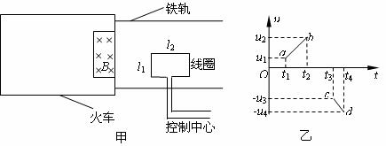 6、2006年7月1日,世界上海拔最高、线路最长的青藏铁路全线通车,青藏铁路安装的一种电磁装置可以向控制中心传输信号,以确定火车的位置和运动状态,其原理是将能产生匀强磁场的磁铁安装在火车首节车厢下面,如图甲所示(俯视图),当它经过安放在两铁轨间的线圈时,线圈便产生一个电信号传输给控制中心.线圈边长分别为l1和l2,匝数为n,线圈和传输线的电阻忽略不计.若火车通过线圈时,控制中心接收到线圈两端的电压信号u与时间t的关系如图乙所示(ab、cd均为直线),t1、t2、t3、t4是运动过程的四个时刻,则火车的运动下列正确的是: