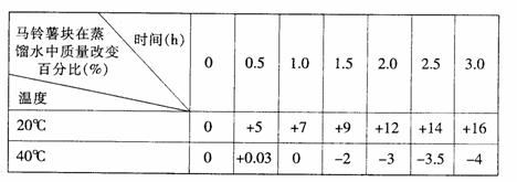 (3)现提供下列实验用品:分别从新鲜叶片中提取完整的线粒体悬浮液和叶绿体悬浮液,丙铜酸溶液、 溶液、试管、光源、澄清的石灰水、卫生香、火柴等,请设计实验验证:线粒体内发生细胞呼吸过程产生 和叶绿体内发生光合作用产生 。 实验设计: 步骤一:____________________________________________________________。 步骤二:____________________________________________________________。 预测实验现象:______________________________________________________。 实验结论:__________________________________________________________。 30 . ( 12分)为探究温度对膜透性的影响,取质量和形态相同的两块马铃薯进行对照实验,所得到的结果如下: