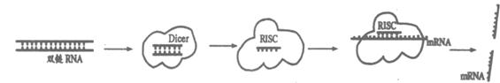 30.(20分)美国科学家安德鲁?法尔和克雷格?梅洛因为发现“RNA干扰机制――双链RNA沉默基因”而获得2006年诺贝尔生理学或医学奖。RNA干扰的机制如下:双链RNA一旦进入细胞内就会被一个称为Dicer的特定的酶切割成2l~23个核苷酸长的小分子干涉RNA(SiRNA)。SiRNA片断与一系列酶结合组成诱导沉默复合体(RISC)。激活的RISC通过碱基配对结合到与SiRNA同源的mRNA上,并切割该mRNA,造成蛋白质无法合成(如下图所示)。回答下列问题: (1) RNA干扰技术具有广泛的应用前景。如用于乙型肝炎的治疗时可以根据乙肝病毒基