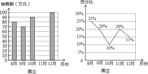(1)来自商场财务部的报告表明,商场8-12月份的销售总额一共是360万元,请你根据这一信息补全统计图①;