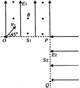 2500N/C,方向竖直向上;磁感应强度B=103T,方向垂直纸面向外;有一质量m=1×10-2kg、电荷量q=4×10-5C的带正电小球自O点沿与水平线成45°以v0=4m/s的速度射入复合场中,之后小球恰好从P点进入电场强度E2=2500N/C,方向水平向左的第二个匀强电场中。不计空气阻力,g取10m/s2。![]()