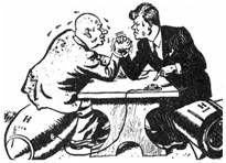 美苏是二战后崛起的两个超级大国,在长达30多年的争霸斗争中,双方剑拔弩张,战争一触即发。下图是一幅反映古巴导弹危机的政治漫画,结合所学知识判断图中满头大汗的人物应是 ( )