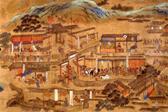 材料一图是《南都繁会图》的一部分。这幅历史长卷生动地描绘了明永乐年间南京秦淮河两岸的盛况。画卷中街市纵横,店铺林立,车马行人摩肩接踵,标牌广告林林总总。两岸建筑有:佛寺、官衙、戏台、民居、牌坊、水榭、城门,层层叠叠;茶庄、金银店、药店、浴室,乃至鸡鸭行、猪行、羊行、粮油谷行,应有尽有。河中运粮船、龙舟、渔船往来穿梭,还有从内秦淮河拐出的唱戏的小船……