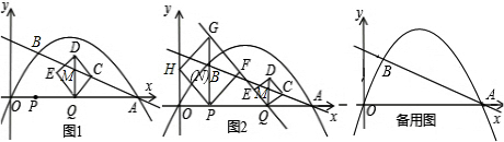 如图1,在平面直角坐标系中,抛物线过原点O,点A(10,0)和点B(2,2),在线段OA上,点P从点O向点A运动,同时点Q从点A向点O运动,运动过程中保持AQ=2OP,当P、Q重合时同时停止运动,过点Q作x轴的垂线,交直线AB于点M,延长QM到点D,使MD=MQ,以QD为对角线作正方形QCDE(正方形QCDE岁点Q运动).