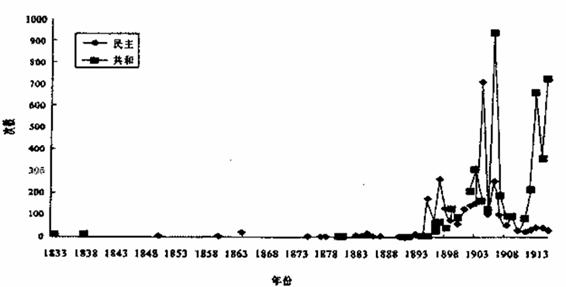 (1)据材料一指出1895~1913年“民主”、“共和”字眼出现的频率呈现什么趋势?当时导致这一趋势出现的重大政治事件有哪些?