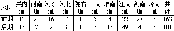 | 地区 | 关内道 | 河南道 | 河东道 | 河北道 | 陇右道 | 山南道 | 淮南道 | 江南道 | 剑南道 | 岭南道 | 共计 |