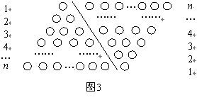 如果采用数形结合的方法,即用图形的性质来说明数量关系的事实,那就非常的直观.现利用图形的性质来求1+2+3+4+…+n 的值,方案如下:如图3,斜线左边的三角形图案是由上到下每层依次分别为1,2,3,…,n个小圆圈排列组成的.而组成整个三角形小圆圈的个数恰为所求式子1+2+3+4+…+n的值.为求式子的值,现把左边三角形倒放于斜线右边,与原三角形组成一个平行四边形.此时,组成平行四边形的小圆圈共有n行,每行有(n+1)个小圆圈,所以组成平行四边形小圆圈的总个数为n(n+1)个,因此,组成一个三角形小圆圈的个数为