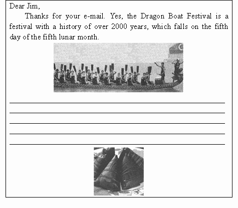 假如你的美国网友Jim发来一封e-mail,向你了解我国传统节日端午节的情况,请你根据中文提示和图片利用本单元学过的词汇写一封图文并茂的电子文档发给他。