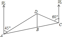 如图、A、B、C、三市在同一直线上,某天然气公司的主输气管道从A市沿A→B→C→D的线路输送天然气,某测绘员测得D市在A市东北方向,在B市正北方向,在C市北偏西60°方向.C市在A市北偏东75°方向.B、D两市相距20km,问天然气从A市输送到D市的路程是多少?(结果保留整数,参考数据: