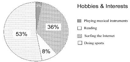 下面的饼状图(pie chat)显示了你对你校学生兴趣爱好的调查结果。请你用英语给English Weekly写一篇短文,报道你的调查结果,并对此结果发表你的看法或建议。字数120词左右。首句已给出(不计入词数)。