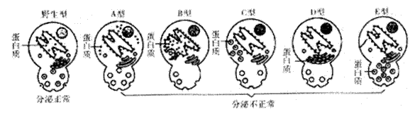科学家利用酵母菌突变体揭示了分泌蛋白的运输过程。下图中野生型是分泌正常的酵母菌。A型~E型突变体是由于基因突变导致内膜结构异常,分泌过程出现障碍的酵母菌。下列说法错误的是( )![]()