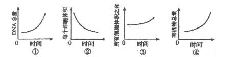 下图表示哺乳动物的受精卵发育至囊胚过程中,DNA总量、每个细胞体积、所有细胞体积之和、有机物总量的变化趋势(横坐标为发育时间)。其中正确的是