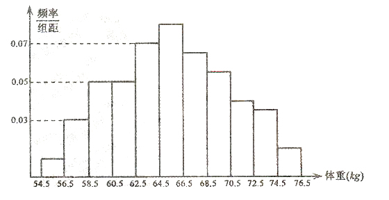 (08年哈三中文)为了了解某地区高三学生的身体发育情况,抽查了该地区100名年龄为17.5岁―18岁的男生体重(kg),得到频率分布直方图如右图,根据右图可得这100名学生中体重在
