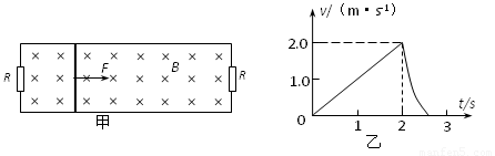 如图甲所示,水平放置足够长的平行金属导轨,左右两端分别接有一个阻值为R的电阻,匀强磁场与导轨平面垂直,质量m = 0.1 kg、电阻r =