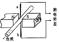 09·宁夏·16)医生做某些特殊手术时,利用电磁血流计来监测通过动脉的血流速度。电磁血流计由一对电极a和b以及磁极N和S构成,磁极间的磁场是均匀的。使用时,两电极a、b均与血管壁接触,两触点的连线、磁场方向和血流速度方向两两垂直,如图所示。由于血液中的正负离子随血流一起在磁场中运动,电极a、b之间会有微小电势差。在达到平衡时,血管内部的电场可看作是匀强电场,血液中的离子所受的电场力和磁场力的合力为零。在某次监测中,两触点的距离为3.0mm,血管壁的厚度可忽略,两触点间的电势差为160µV,磁感应强度的大小为0.040T。则血流速度的近似值和电极a、b的正负为                                         (  )