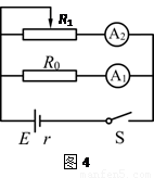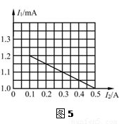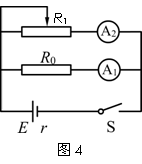 某同学发现上述器材中虽然没有电压表,但提供了两块电流表,于是他设计了如图4所示的电路,并进行实验。该同学测出几组电流表A1、A2的数据I1、I2,利用测出的数据画出I1-I2图像,则由图像可得被测干电池的电动势E=________V,内电阻r=________Ω。