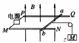 (15分)如图所示,PQ和MN为水平放置的平行金属导轨,间距为l=1.0m,导体棒ab跨放在导轨上,棒的质量为m=20g,棒的中点用细绳经轻滑轮与物体c相连,物体c的质量M=30g。在垂直导轨平面方向存在磁感应强度B=0.2T的匀强磁场,磁场方向竖直向上,重力加速度g取10m/s2。
