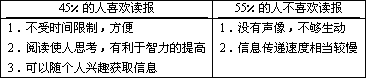 | 1.不受时间限制,方便 2.阅读使人思考,有利于智力的提高 3.可以随个人兴趣获取信息 | 1.没有声像,不够生动 2.信息传递速度相对较慢 |